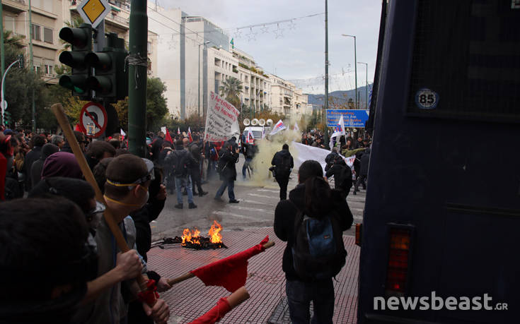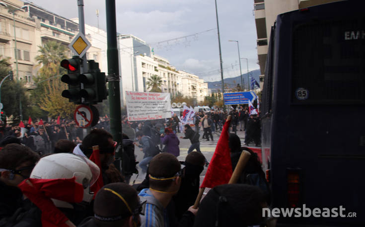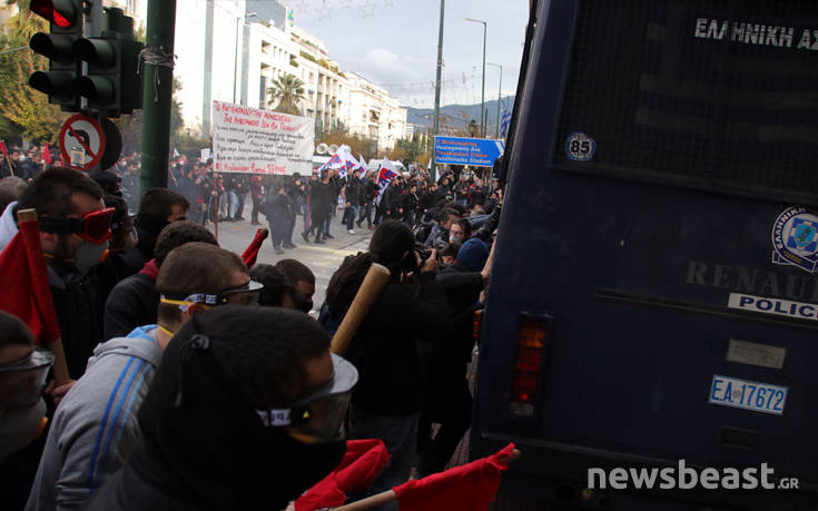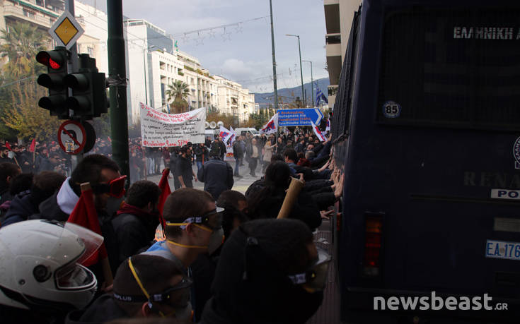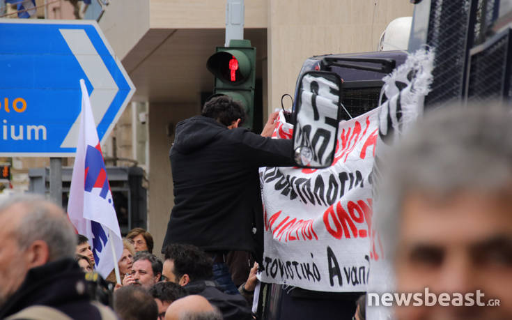 Οι δυνάμεις των ΜΑΤ έχουν τοποθετήσει μπροστά από το κτίριο της Αντιπροσωπείας της Ευρωπαϊκής Επιτροπής κλούβες, ενώ από πίσω έχουν παραταχθεί οι αστυνομικοί. Οι διαδηλωτές κουνούσαν τις κλούβες, επιμένοντας να περάσουν τον κλοιό, ενώ από την πλευρά των Αρχών έγινε χρήση δακρυγόνων για να τους απομακρύνουν.