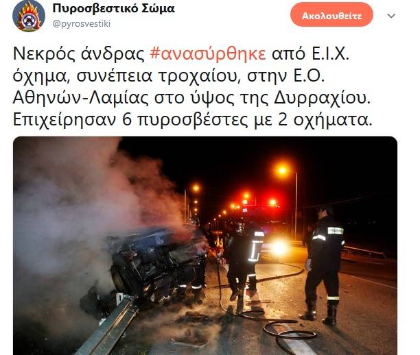 Νεκρός άνδρας #ανασύρθηκε από Ε.Ι.Χ. όχημα, συνέπεια τροχαίου, στην Ε.Ο. Αθηνών-Λαμίας στο ύψος της Δυρραχίου. Επιχείρησαν 6 πυροσβέστες με 2 οχήματα. pic.twitter.com/AWg12GlUcV
