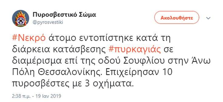 Σύμφωνα με την Πυροσβεστική, ένα νεκρό άτομο εντοπίστηκε κατά τη διάρκεια κατάσβεσης της πυρκαγιάς.