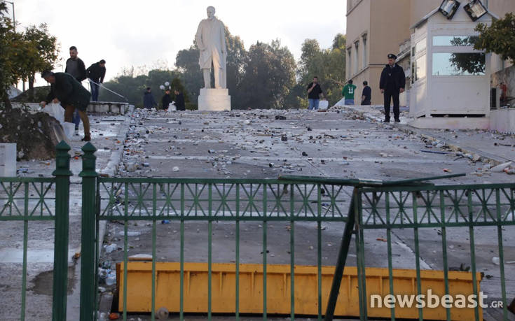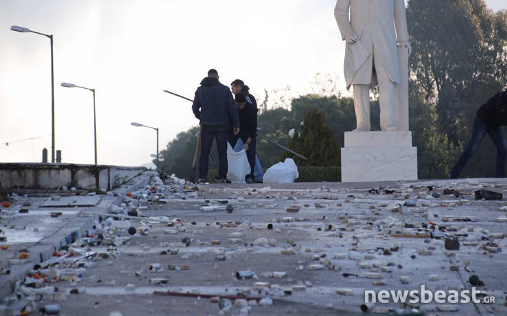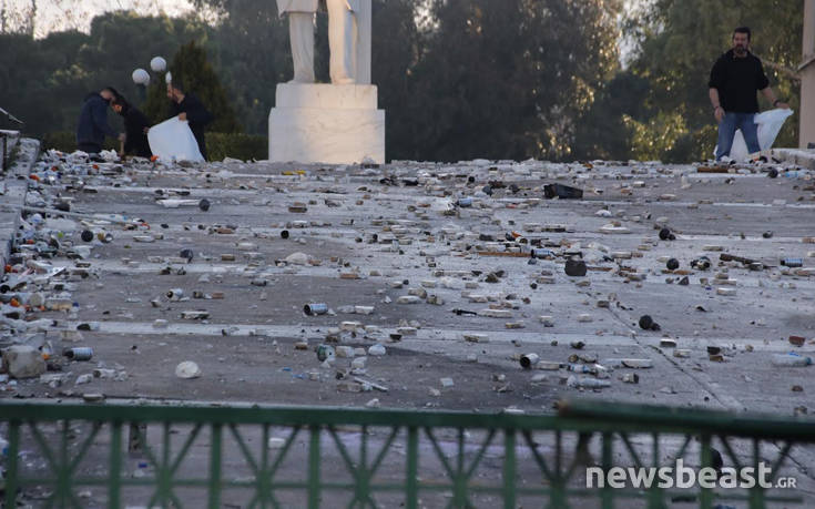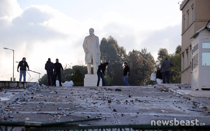 Προσπάθεια να καθαριστεί ο αύλιος χώρος της Βουλής βρίσκεται αυτή τη στιγμή σε εξέλιξη στο κέντρο της Αθήνας, μετά τα εκτεταμένα επεισόδια που σημειώθηκαν στο συλλαλητήριο κατά της Συμφωνίας των Πρεσπών.