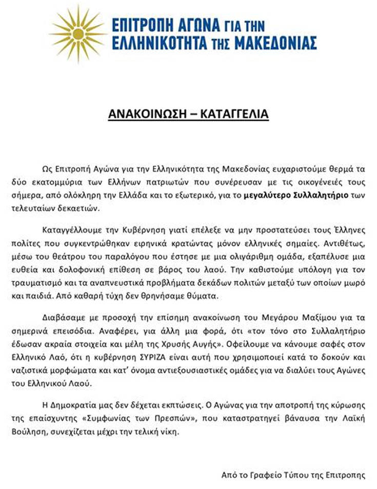 Σε ανακοίνωσή της, η Επιτροπή καταγγέλλει την κυβέρνηση «γιατί επέλεξε να μην προστατεύσει τους Έλληνες πολίτες που συγκεντρώθηκαν ειρηνικά κρατώντας μόνον ελληνικές σημαίες». Απαντά δε στο Μαξίμου, που έκανε λόγο για ακραία στοιχεία και μέλη της Χρυσής Αυγής, που έδωσαν τον τόνο στο συλλαλητήριο, τονίζοντας χαρακτηριστικά: «Η κυβέρνηση ΣΥΡΙΖΑ είναι αυτή που χρησιμοποιεί κατά το δοκούν και ναζιστικά μορφώματα και κατ’ όνομα αντιεξουσιαστικές ομάδες για να διαλύει τους Αγώνες του Ελληνικού Λαού».