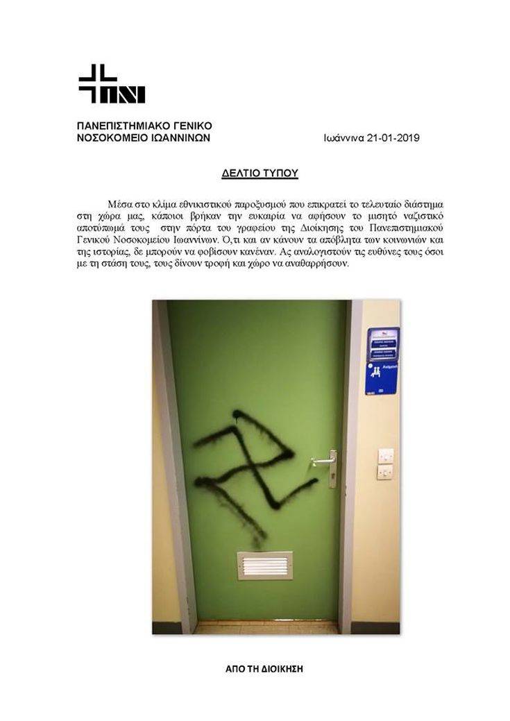 Την έντονη αντίδραση της διοίκησης του Πανεπιστημιακού Νοσοκομείου Ιωαννίνων, προκάλεσε ένας αγκυλωτός σταυρός με μαύρο σπρέι που σχημάτισαν άγνωστοι στην πόρτα εισόδου των γραφείων του διοικητή Βασίλη Τσίκαρη και του αναπληρωτή διοικητή, Κώστα Χολέβα.