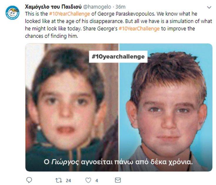 «Αυτό είναι το #10YearChallenge του Γιώργου Παρασκευόπουλου. Ξέρουμε πώς έμοιαζε στην ηλικία που εξαφανίστηκε. Όμως το μόνο που έχουμε είναι μία προσομοίωση του πώς μπορεί να μοιάζει σήμερα. Μοιραστείτε το #10YearChallenge του Γιώργου για να βελτιώσουμε τις πιθανότητες να βρεθεί», αναφέρεται στην ανάρτηση.