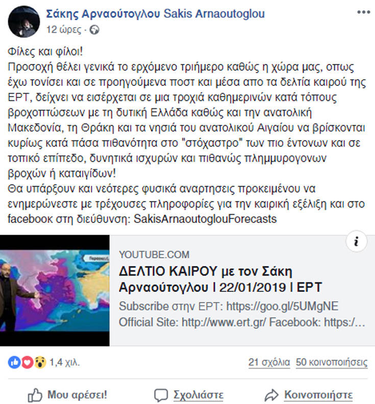 Προσοχή θέλει γενικά το ερχόμενο τριήμερο καθώς η χώρα μας, όπως έχω τονίσει και σε προηγούμενα ποστ και μέσα από τα δελτία καιρού της ΕΡΤ, δείχνει να εισέρχεται σε μια τροχιά καθημερινών κατά τόπους βροχοπτώσεων με τη δυτική Ελλάδα καθώς και την ανατολική Μακεδονία, τη Θράκη και τα νησιά του ανατολικού Αιγαίου να βρίσκονται κυρίως κατά πάσα πιθανότητα στο “στόχαστρο” των πιο έντονων και σε τοπικό επίπεδο, δυνητικά ισχυρών και πιθανώς πλημμυρογονών βροχών ή καταιγίδων!».