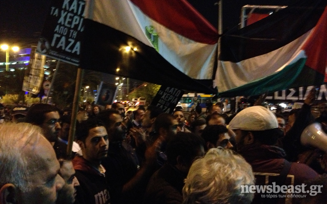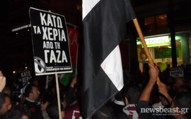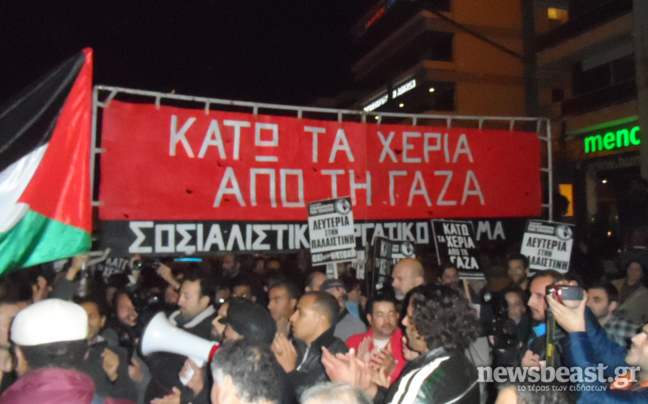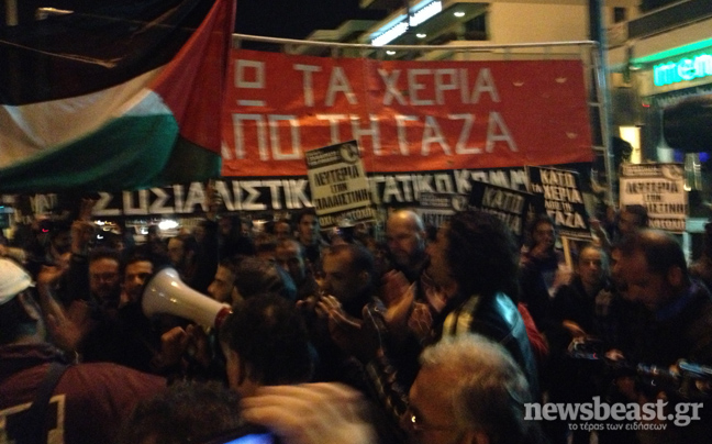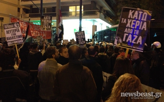 Συγκέντρωση έξω από την πρεσβεία του Ισραήλ στη συμβολή των οδών Κηφισίας και Μουσών στο Ψυχικό πραγματοποιούν αυτή την ώρα διαμαρτυρόμενοι για την επίθεση στη λωρίδα της Γάζας.
