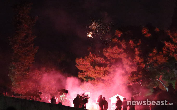 Φωτοβολίδες και καπνογόνα εκσφενδόνισαν πριν από λίγο διαδηλωτές προς τους αστυνομικούς που βρίσκονται στα σκαλιά πίσω από το φυλάκιο του Άγνωστου Στρατιώτη, μπροστά από τη Βουλή.