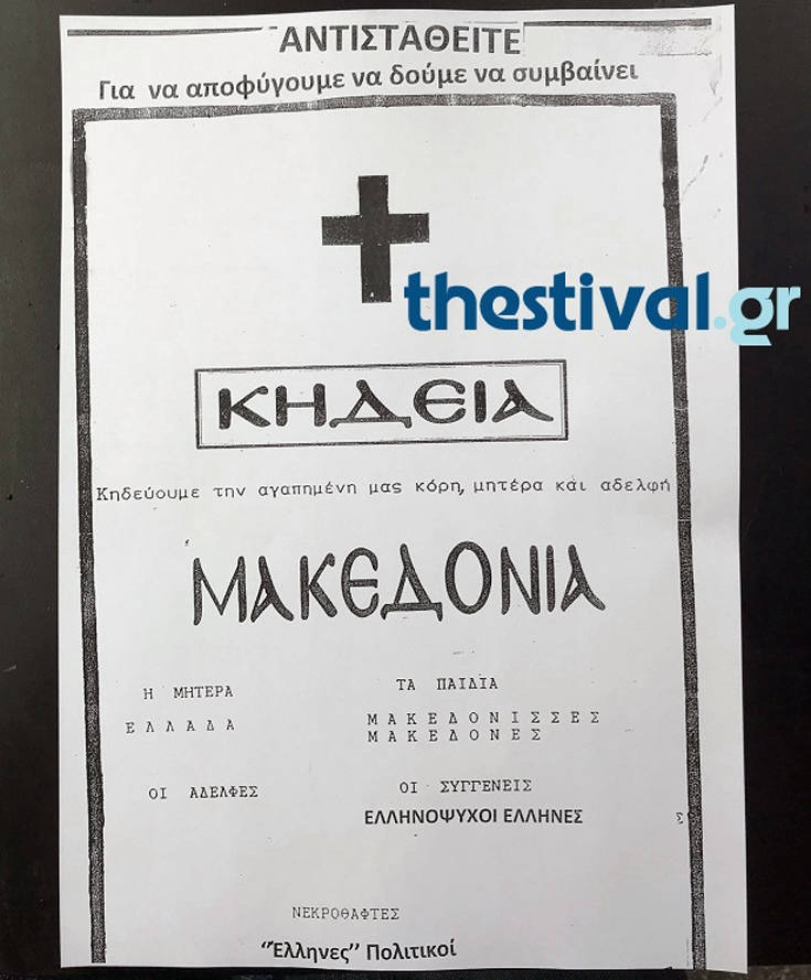 Κηδειόχορτα με το όνομα της Μακεδονίας μοίρασαν σε περαστικούς και θαμώνες καταστημάτων, γύρω από το υπουργείο Μακεδονίας – Θράκης, στη Θεσσαλονίκη πολίτες μου διαμαρτύρονται για τη Συμφωνία των Πρεσπών.