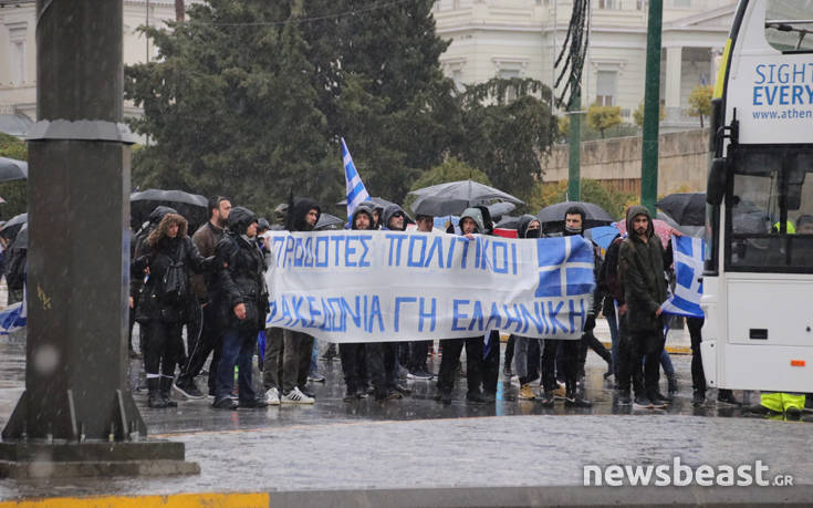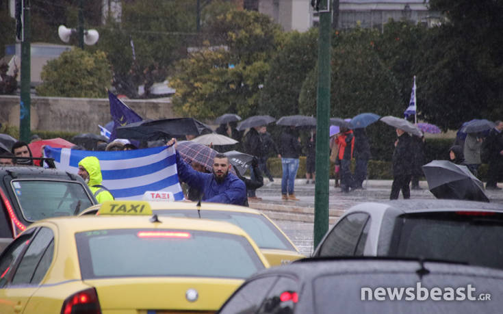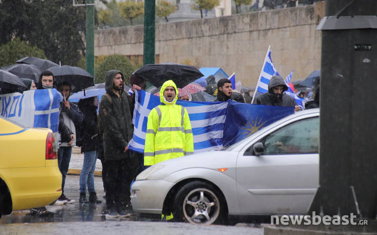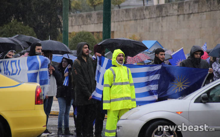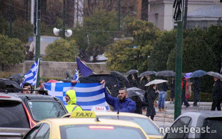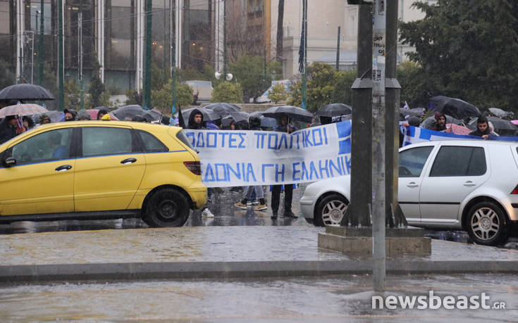 Παρά το γεγονός ότι η βροχή στην Αθήνα συνεχίζεται, με ομπρέλες και με σημαίες στα χέρια τους συνεχίζουν το συλλαλητήριο στο οποίο συμμετέχουν για το Μακεδονικό, την ώρα που η σχετική συζήτηση στο Κοινοβούλιο συνεχίζεται.