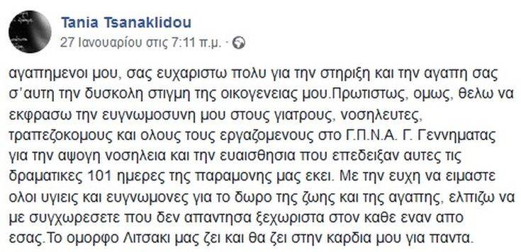 «Αγαπημένοι μου, σας ευχαριστώ πολύ για την στήριξη και την αγάπη σας σ’ αυτή την δύσκολη στιγμή της οικογενείας μου. Πρωτίστως, όμως, θέλω να εκφράσω την ευγνωμοσύνη μου στους γιατρούς, νοσηλευτές, τραπεζοκόμους και όλους τους εργαζόμενους στο Γ.Π.Ν.Α. Γ. Γεννηματάς για την άψογη νοσηλεία και την ευαισθησία που επέδειξαν αυτές τις δραματικές 101 ημέρες της παραμονής μας εκεί. Με την ευχή να είμαστε όλοι υγιείς και ευγνώμονες για το δώρο της ζωής και της αγάπης, ελπίζω να με συγχωρέσετε που δεν απάντησα ξεχωριστά στον κάθε έναν από εσάς. Το όμορφο Λιτσάκι μας ζει και θα ζει στην καρδιά μου για πάντα».