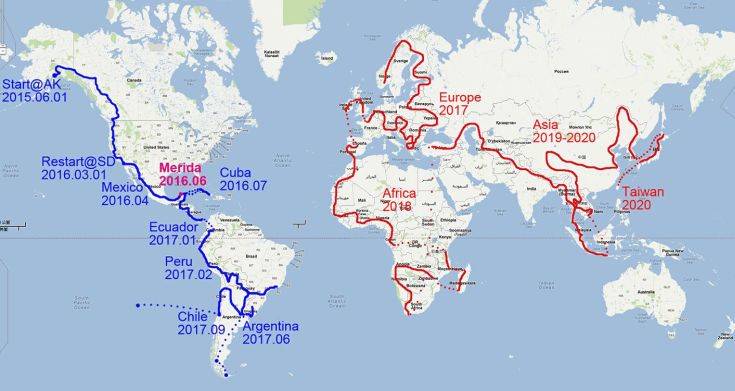 Ο 40χρονος από την Ταϊβάν ξεκίνησε το τεράστιο ταξίδι του το 2015, από την Αλάσκα, ενώ στόχος του -με βάση το σχεδιασμό του- είναι να τερματίσει την σχεδόν εξάχρονη περιπέτειά του το 2021 στη χώρα του.