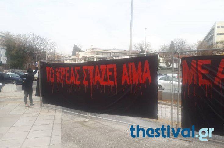 Οι διαδηλωτές συγκεντρώθηκαν έξω από την πύλη της ΔΕΘ στο Συντριβάνι. Κρατούν φωτογραφίες με συνθήματα ενάντια στην κακοποίηση των ζώων και διαμαρτύρονται για την θανάτωση και τον «αναίτιο βασανισμό ζώων», όπως λένε χαρακτηριστικά.