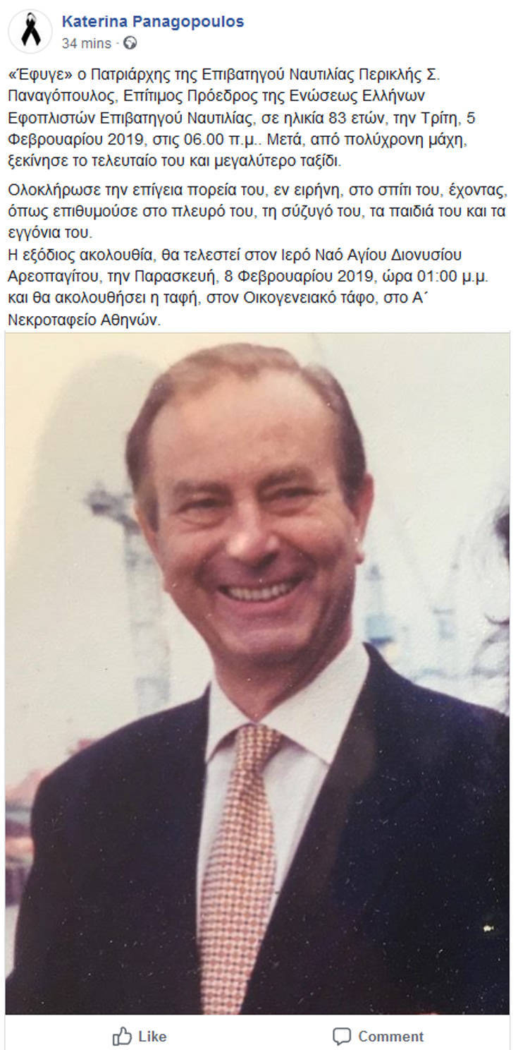 Με μια ανάρτηση στον λογαριασμό της στο Facebook, η σύζυγος του Περικλή Παναγόπουλου, Κατερίνα, έκανε γνωστή την είδηση του θανάτου του εφοπλιστή σε ηλικία 83 ετών, την Τρίτη 5 Φεβρουαρίου.