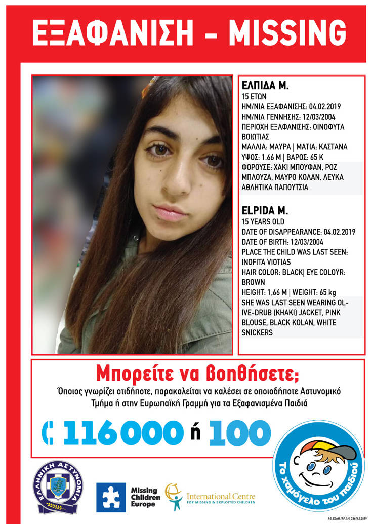 Η Ελπίδα Μ.,15 ετών, εξαφανίστηκε τη Δευτέρα 4 Φεβρουαρίου 2019 στις 16:00 ώρα. Για την εξαφάνιση της ανήλικης «Το Χαμόγελο του Παιδιού» ενημερώθηκε στις 05/02/2019, κατά τις πρώτες πρωινές ώρες.