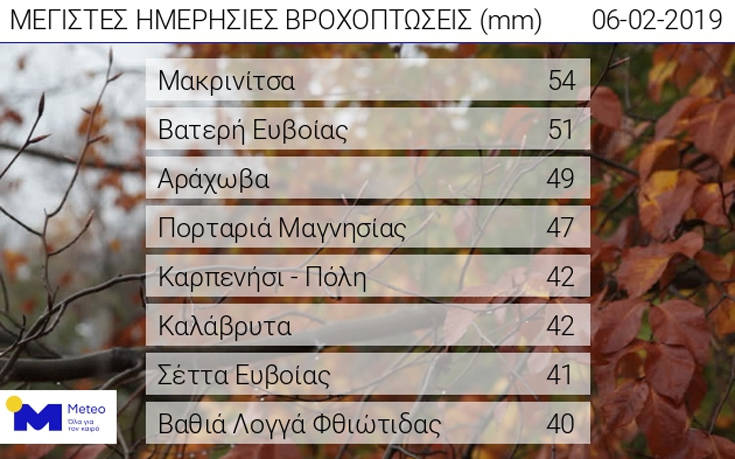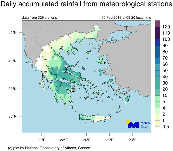 Αυτό είχε ως αποτέλεσμα να σημειωθούν σημαντικά ύψη βροχόπτωσης κυρίως στα κεντρικά και νότια, από τα μεσάνυχτα έως τις πρωινές ώρες της Τετάρτης 06/02, όπως καταγράφηκαν από το δίκτυο αυτόματων μετεωρολογικών σταθμών του Εθνικού Αστεροσκοπείου Αθηνών / Meteo.gr, με τα μεγαλύτερα ύψη βροχής να καταγράφονται στη Θεσσαλία, στην Εύβοια, την Κεντρική Στερεά και την Πελοπόννησο.