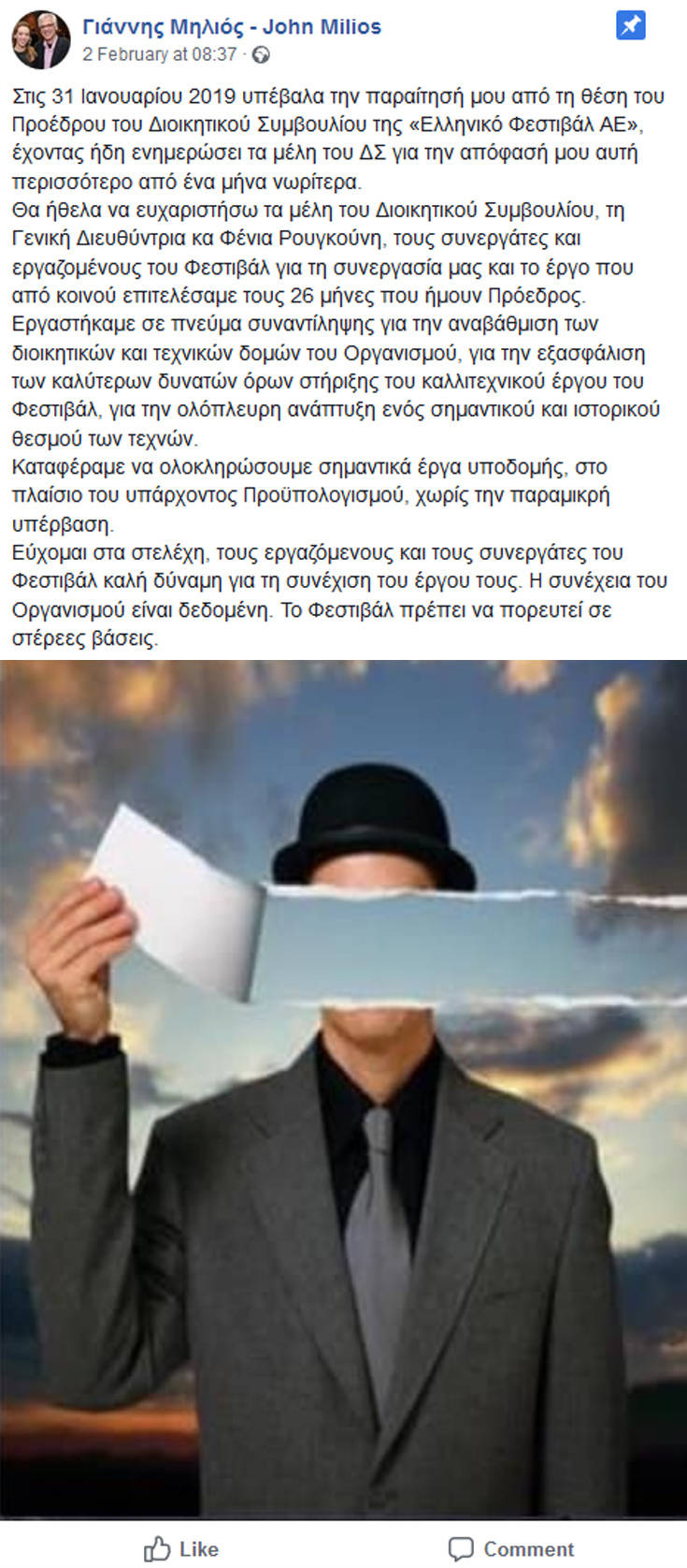 Στις 31 Ιανουαρίου 2019 υπέβαλα την παραίτησή μου από τη θέση του Προέδρου του Διοικητικού Συμβουλίου της “Ελληνικό Φεστιβάλ ΑΕ”, έχοντας ήδη ενημερώσει τα μέλη του ΔΣ για την απόφασή μου αυτή περισσότερο από ένα μήνα νωρίτερα.