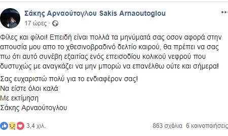 Συγκεκριμένα, ο Σάκης Αρναούτογλου έγραψε πως ταλαιπωρείται από έναν κολικό νεφρού, ενώ ευχαρίστησε το κοινό για το ενδιαφέρον που έχει δείξει.