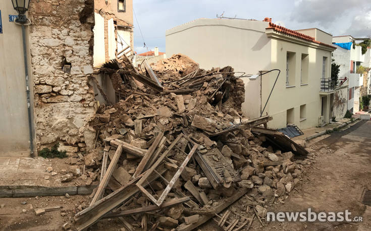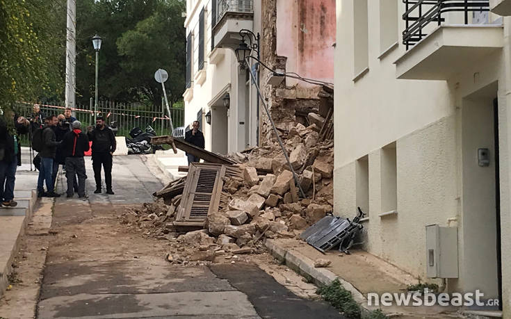 Συντρίμμια γέμισε η οδός Ιουλίου Σμιθ στην Πνύκα, όπου νωρίτερα κατέρρευσε ένα εγκαταλελειμμένο σπίτι.