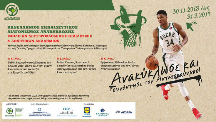 Στο πλαίσιο της ανάδειξης της δυναμικής της ανακύκλωσης σε Δήμους όλης της χώρας, η Ανταποδοτική Ανακύκλωση, διοργανώνει για πρώτη φορά τον «Μεγάλο Πανελλήνιο Διαγωνισμό Ανακύκλωσης Σχολείων Δευτεροβάθμιας Εκπαίδευσης & Αθλητικών Ακαδημιών – Ανακυκλώνουμε μαζί με τον Γιάννη Αντετοκούνμπο» σε Δήμους όλης της χώρας.
