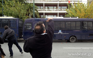 Ντομάτες και νεράντζια στις κλούβες των ΜΑΤ, που βρίσκονται παρατεταγμένες έξω από το υπουργείο Διοικητικής Μεταρρύθμισης, εκτόξευσαν διαμαρτυρόμενοι, που αντιδρούν στο μέτρο της διαθεσιμότητας.