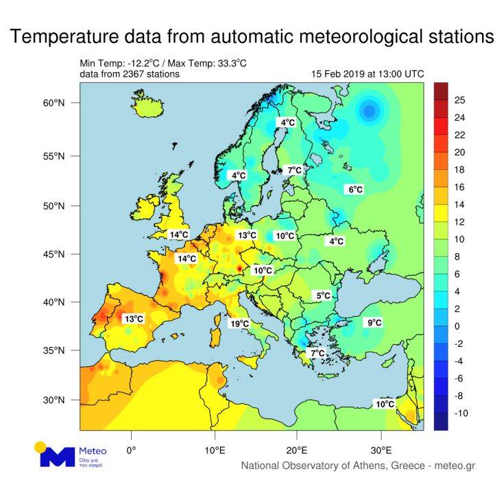 Μια από τις πιο ψυχρές περιοχές της Ευρώπης με τον υδράργυρο να μην ξεπερνάει τους 8°C στις περισσότερες περιοχές της Ανατολικής και Βόρειας Ελλάδας αποτελούσε η χώρα μας το απόγευμα της Παρασκευής 15 Φεβρουαρίου. Την ίδια ώρα, σύμφωνα με την υπηρεσία meteo του Εθνικού Αστεροσκοπείου Αθηνών, στη Δυτική Ευρώπη η θερμοκρασία ξεπερνάει τους 20°C, περίπου 10ºC πάνω από τις κανονικές για την εποχή τιμές.