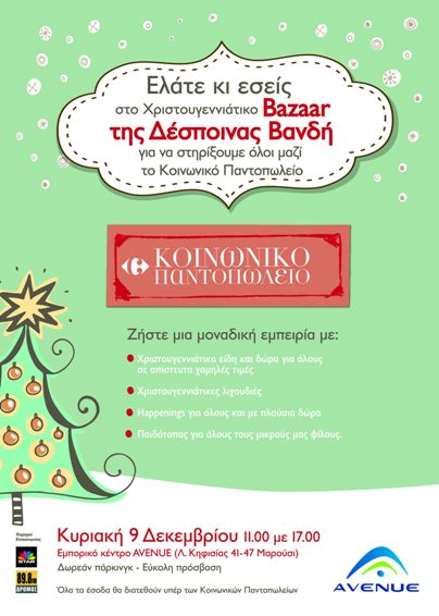 Για τρίτη συνεχόμενη χρονιά η Δέσποινα Βανδή διοργανώνει το καθιερωμένο Χριστουγεννιάτικο Bazaar Αγάπης και την Κυριακή 9 Δεκεμβρίου στις 11.00 το πρωί θα υποδεχτεί μικρούς και μεγάλους στο εμπορικό κέντρο Avenue.