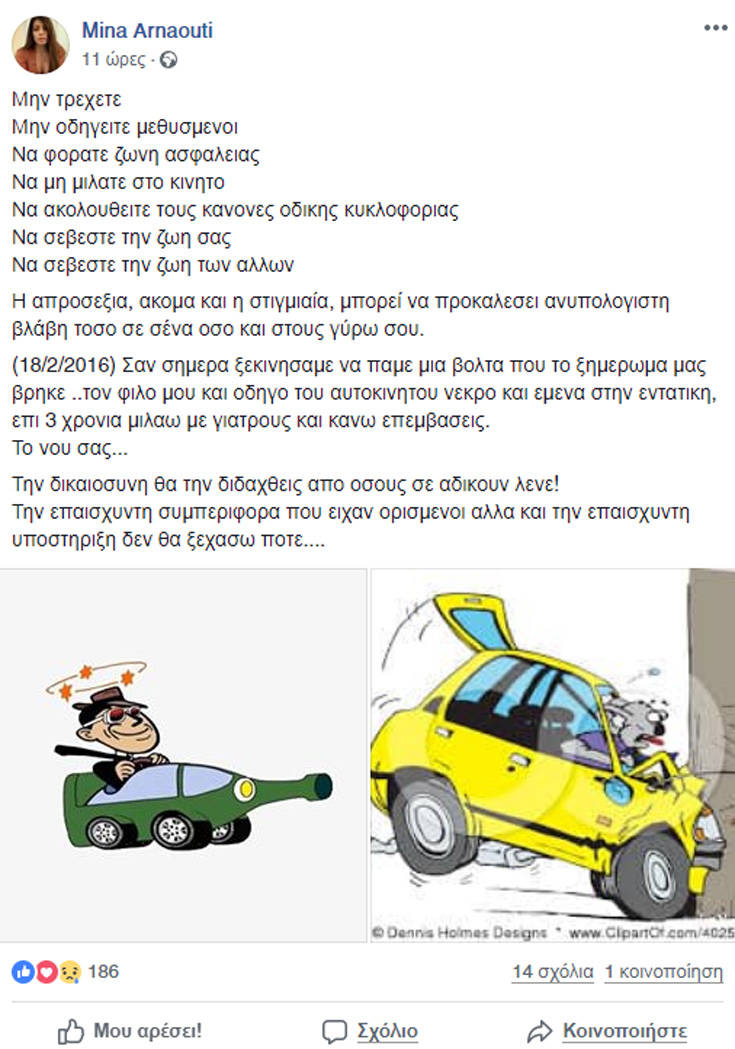 Η Μίνα Αρναούτη έκανε μια ανάρτηση στον προσωπικό της λογαριασμό στο facebook, όπου αναφέρθηκε σε εκείνη τη μέρα και έστειλε το δικό της μήνυμα σε όλο τον κόσμο.