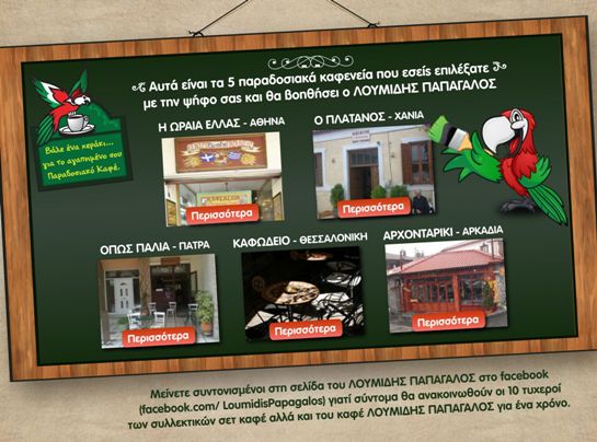 Η αναμονή έλαβε τέλος. Η μεγάλη ενέργεια «Βάλε ένα χεράκι… για το αγαπημένο σου παραδοσιακό καφέ» ξεκίνησε τον Σεπτέμβριο και ολοκληρώθηκε με πάνω από 11.000 συμμετοχές από τους φίλους του καφέ Λουμίσδης Παπαγάλος στο www.facebook.com/LoumidisPapagalos, αναδεικνύοντας τα πέντε αγαπημένα παραδοσιακά καφέ της Ελλάδας.