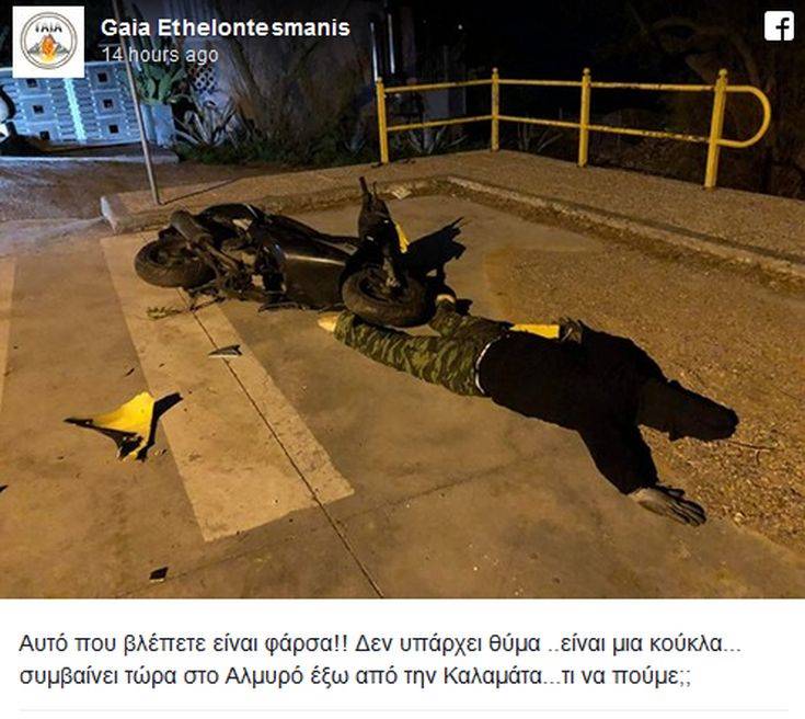 Όπως αναφέρει η ομάδα εθελοντών Μάνης «Γαία» στο Facebook η εικόνα με ένα μηχανάκι πεσμένο σαν τρακαρισμένο και μπροστά του πεσμένη μία κούκλα έκανε πολλούς να σταματήσουν νομίζοντας ότι υπάρχει κάποιο ατύχημα.