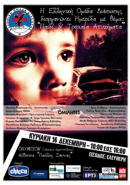 Με αφορμή την Παγκόσμια Ημέρα Παιδιού που γιορτάζεται στις 11 Δεκεμβρίου και με στόχο την ευαισθητοποίηση των πολιτών στο θέμα της οδικής ασφάλειας, ειδικά στις περιπτώσεις όπου εμπλέκονται παιδιά, η Ελληνική Ομάδα Διάσωσης διοργανώνει στη Θεσσαλονίκη ημερίδα με θέμα το Παιδί και τα Τροχαία Ατυχήματα.