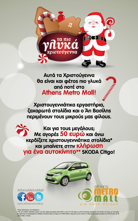 Οι επισκέπτες του Athens Metro Mall με αγορές από 50 ευρώ και άνω κερδίζουν χριστουγεννιάτικα στολίδια* και συμμετέχουν στη μεγάλη κλήρωση για ένα αυτοκίνητο** SKODA Citigo, η οποία θα πραγματοποιηθεί στις 7 Ιανουαρίου 2013!