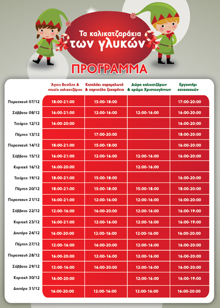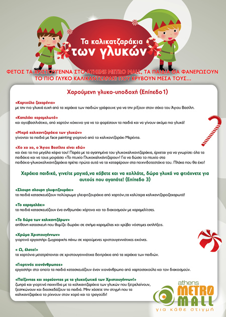 Όλο τον Δεκέμβριο στο Athens Metro Mall, οι μικροί μας φίλοι συμμετέχουν στις χριστουγεννιάτικες δραστηριότητες του εμπορικού «Τα Καλικαντζαράκια των Γλυκών» με ελεύθερη είσοδο και διασκεδάζουν με τον αγαπημένο Άγιο Βασίλη! Τα παιδιά φτιάχνουν «Καρτούλες ζαχαρένιες» και «Καπελάκια καραμελωτά» και πολλές ακόμα «γλυκές» κατασκευές για να τις χαρίσουν σε αυτούς που αγαπούν ενώ ο Άγιος Βασίλης παρέα με τα αγαπημένα του γλυκοκαλικαντζαράκια έρχεται να γνωρίσει όλα τα παιδάκια και να τους μοιράσει «Το Πτυχίο Γλυκοκαλικάντζαρου».