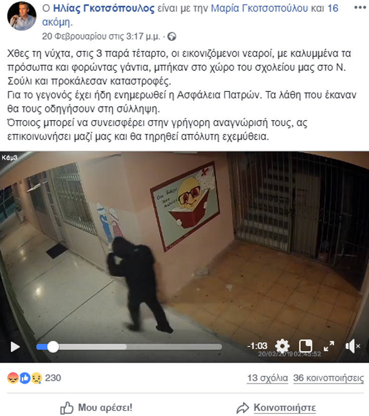 Στόχος νεαρών με καλυμμένα τα χαρακτηριστικά έγινε το Δημοτικό Σχολείο στο Νέο Σούλι της Πάτρας. Οι νεαροί προκάλεσαν φθορές στο σχολείο και η δράση τους καταγράφηκε από την κάμερα ασφαλείας.