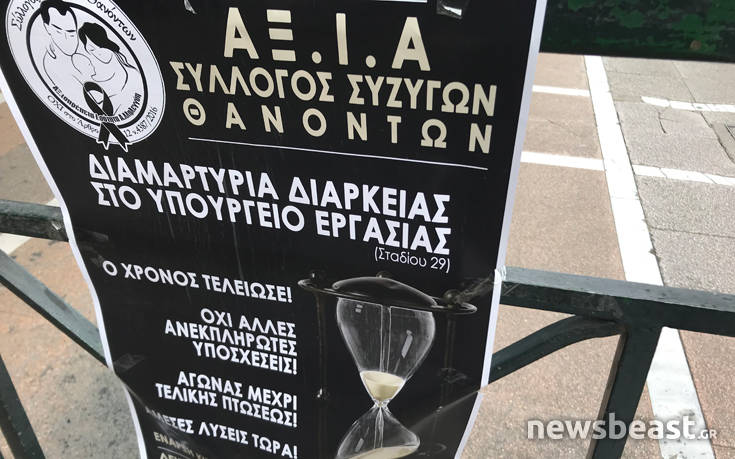 Συγκέντρωση διαμαρτυρίας διαρκείας πραγματοποιούν από σήμερα έξω από το υπουργείο Εργασίας στην οδό Σταδίου, μέλη του Συλλόγου Συζύγων Θανόντων (Αξιοπρέπεια Ισότητα Αλληλεγγύη) με βασικό αίτημα την κατάργηση ηλικιακών κριτηρίων στη χορήγηση σύνταξης.
