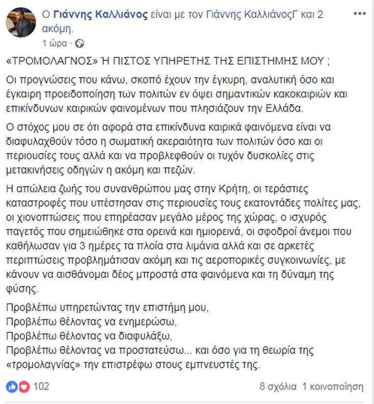 «Πιστός υπηρέτης της επιστήμης» της μετεωρολογίας δηλώνει ο Γιάννης Καλλιάνος, απαντώντας σε όσους τον κατηγόρησαν για «τρομολαγνεία» λόγω των προβλέψεών του για το πέρασμα της κακοκαιρίας «Ωκεανίς» από τη χώρα μας.