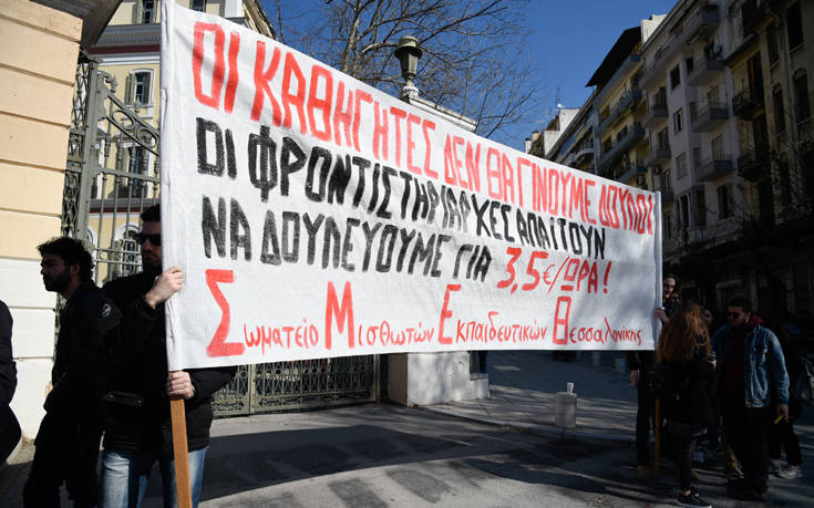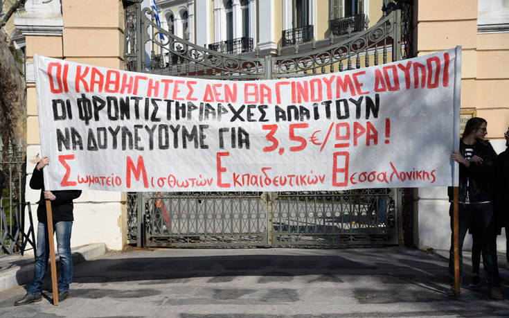 Τις κινητοποιήσεις τους με αίτημα την απόσυρση της προσφυγής που έχει καταθέσει στο Συμβούλιο της Επικρατείας η Ομοσπονδία Εκπαιδευτών Φροντιστών Ελλάδας (ΟΕΦΕ), με την οποία ζητείται ακύρωση διατάξεων που ορίζουν ως ελάχιστο ωρομίσθιο καθηγητή σε φροντιστήριο τα 6,70 ευρώ μεικτά, συνέχισαν σήμερα έξω από το υπουργείο Μακεδονίας-Θράκης μέλη του Σωματείου Μισθωτών Εκπαιδευτικών Θεσσαλονίκης (ΣΜΕΘ).