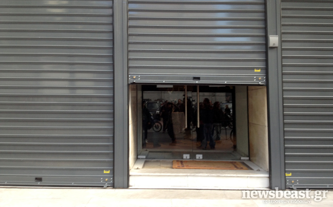 Οι εργαζόμενοι στο Τ.Ε.Α.Δ.Υ. μόλις αντιλήφθηκαν ότι η πορεία των εργαζομένων πλησιάζει προς τα εκεί, έκλεισαν όλα τα ρολά εκτός από ένα, από το οποίο προσπαθούν να μπουν μέσα.