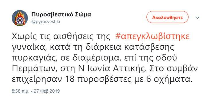 Μια γυναίκα χωρίς τις αισθήσεις της ανέσυραν οι πυροσβέστες από διαμέρισμα στην οδό Περματών, στη Νέα Ιωνία, το οποίο έπιασε φωτιά.