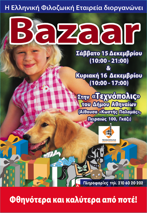 Το Μεγάλο Χριστουγεννιάτικο Παζάρι της Ελληνικής Φιλοζωικής Εταιρείας θα πραγματοποιηθεί στην «Τεχνόπολις» του Δήμου Αθηναίων, αίθουσα «Κωστής Παλαμάς» Κτίριο «Δ10», (Πειραιώς 100, Γκάζι), από το Σάββατο 15 Δεκεμβρίου και Κυριακή 16 Δεκεμβρίου.