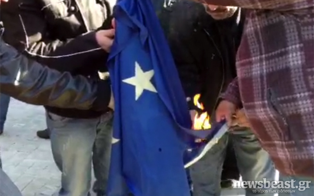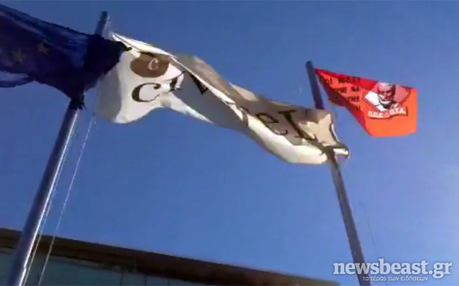 Οι εργαζόμενοι στην ΠΟΕ-ΟΤΑ κρεμασαν τη σημαία του σωματείου τους ενώ έκαψαν αυτήν της Ευρωπαϊκής Ένωσης