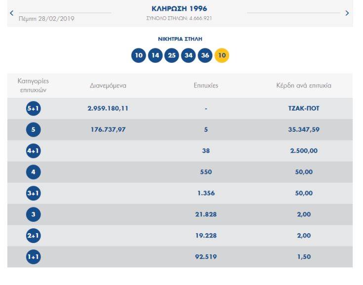 Οι τυχεροί αριθμοί του ΤΖΟΚΕΡ είναι: 10, 14, 25, 34, 36 ΤΖΟΚΕΡ: 10