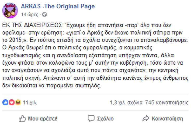 Απάντηση στο γιατί ο Αρκάς «δεν έκανε πολιτική σάτιρα πριν το 2015» δίνουν οι διαχειριστές της σελίδας του στο Facebook, τονίζοντας πως έχουν ήδη απαντήσει αλλά επειδή τα σχόλια συνεχίζονται επαναλαμβάνουν την εξήγηση.