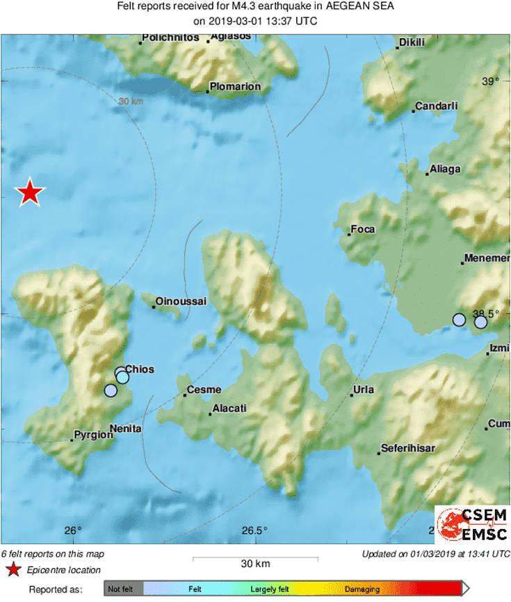 Σεισμός σημειώθηκε πριν από λίγη ώρα στο Αιγαίο με το επίκεντρο να εντοπίζεται 38 χιλιόμετρα βόρειο-βορειοδυτικά της Χίου.