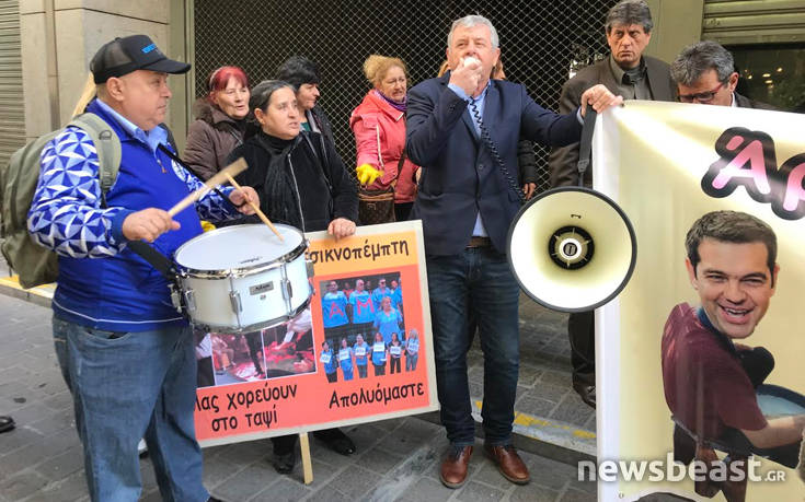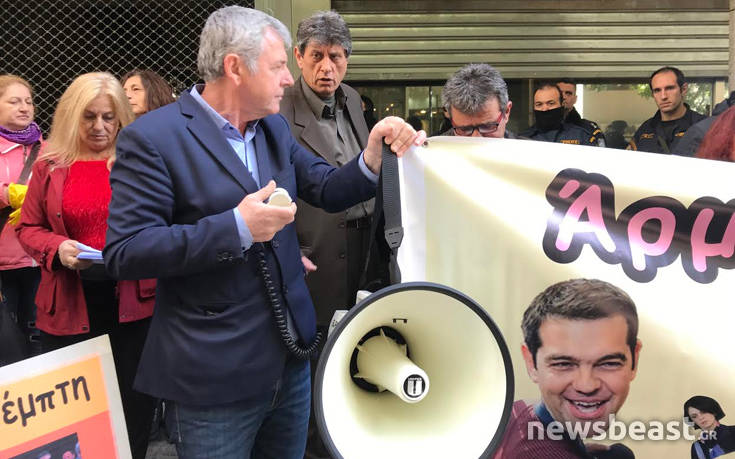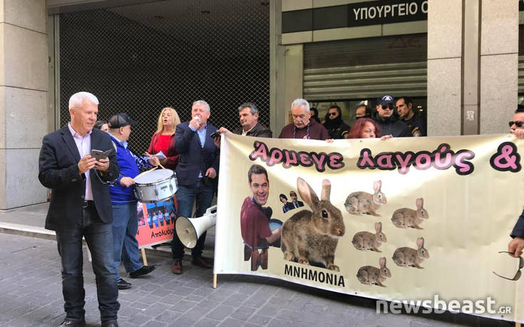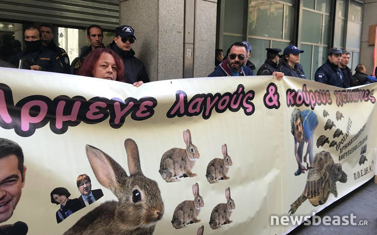 Το ενδιαφέρον από τη διαμαρτυρία στην οδό Νίκης, έχει να κάνει με το πανό που κρατούσαν στα χέρια τους οι συγκεντρωμένοι, στο οποίο εμφανίζεται ο Αλέξης Τσίπρας δίπλα σε λαγούς και ο Παύλος Πολάκης κοντά σε κάποιες χελώνες, με το σύνθημα που κυριαρχεί να είναι: «Άρμεγε λαγούς και κούρευε χελώνες».