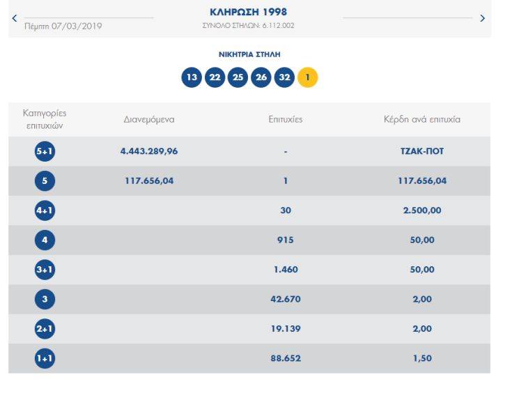 Οι τυχεροί αριθμοί του ΤΖΟΚΕΡ είναι: 13, 22, 25, 26, 32 ΤΖΟΚΕΡ: 1