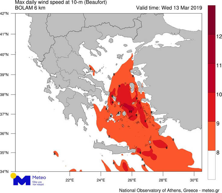 Χάρτης 3. Περιοχές όπου αναμένονται θυελλώδεις άνεμοι με εντάσεις πάνω από 8 μποφόρ, κατά τη διάρκεια της Τετάρτης 13 Μαρτίου 2019