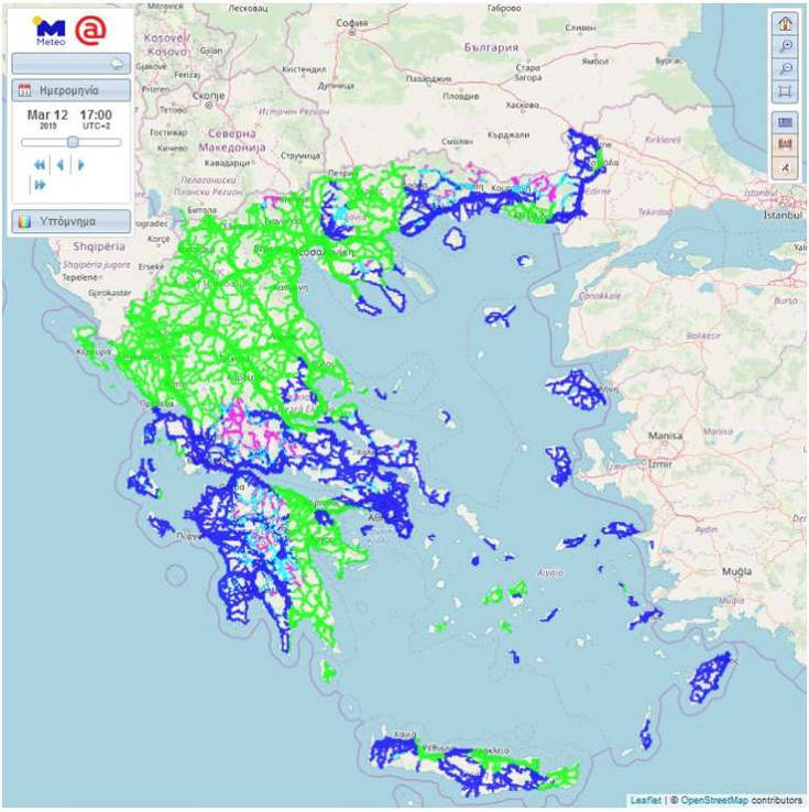 Στο χάρτη που ακολουθεί παρουσιάζονται οι καιρικές συνθήκες που θα επικρατούν στο οδικό δίκτυο της χώρας κατά τις απογευματινές ώρες της Τρίτης 12/03 με βάση τη νέα υπηρεσία ROADS του Εθνικού Αστεροσκοπείου Αθηνών/meteo.gr.