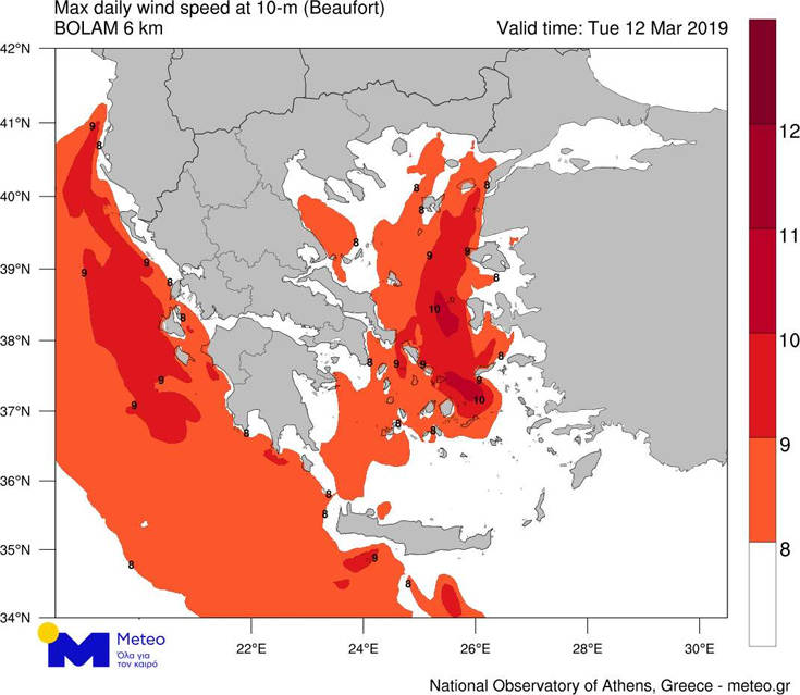 Χάρτης 1. Περιοχές όπου αναμένονται θυελλώδεις άνεμοι με εντάσεις πάνω από 8 μποφόρ, κατά τη διάρκεια της Τρίτης 12 Μαρτίου 2019