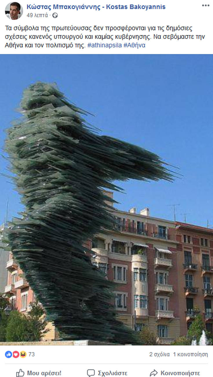 Για το θέμα τοποθετήθηκε μέσω Facebook ο υποψήφιος δήμαρχος Αθηναίων Κώστας Μπακογιάννης, σημειώνοντας: «Τα σύμβολα της πρωτεύουσας δεν προσφέρονται για τις δημόσιες σχέσεις κανενός υπουργού και καμίας κυβέρνησης. Να σεβόμαστε την Αθήνα και τον πολιτισμό της».