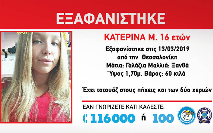 Ειδικότερα, στις 13 Μαρτίου στις 23:00 το βράδυ, εξαφανίστηκε από την περιοχή της Σταυρούπολης Θεσσαλονίκης η Κατερίνα Μ., 16 ετών. Για την εξαφάνιση της ανήλικης το Χαμόγελο του Παιδιού ενημερώθηκε στις 15 Μαρτίου το απόγευμα.