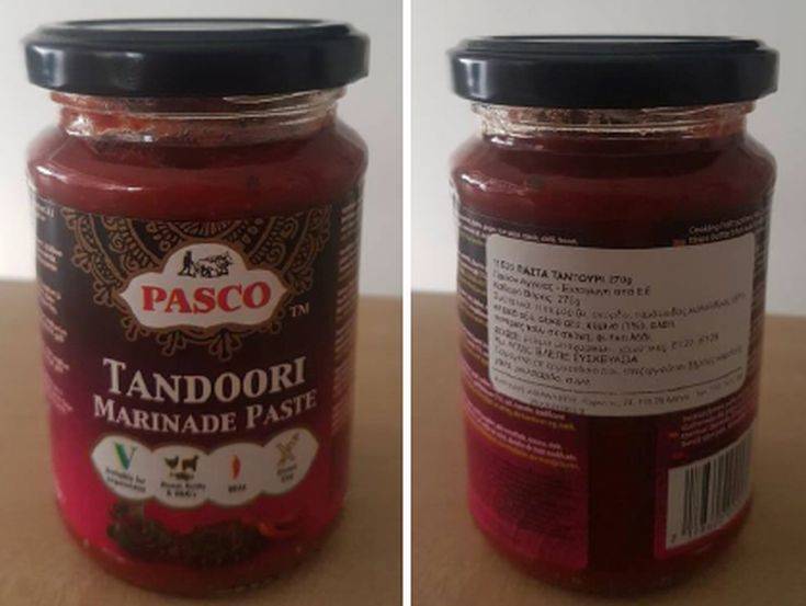 Πρόκειται για το προϊόν με την εμπορική ονομασία «Pasco Tandoori Marinade Paste», σε γυάλινο βάζο των 270g, με αριθμό παρτίδας 811170 και ημερομηνία ανάλωσης κατά προτίμηση πριν από 30.11.2021. Το εν λόγω προϊόν διακινήθηκε από την επιχείρηση «Asiana Ltd» (Κορινθίας 24, ΤΚ 115 26, Αθήνα).